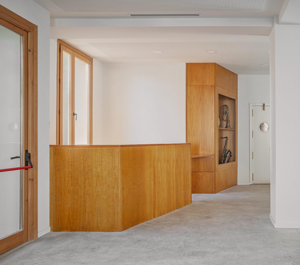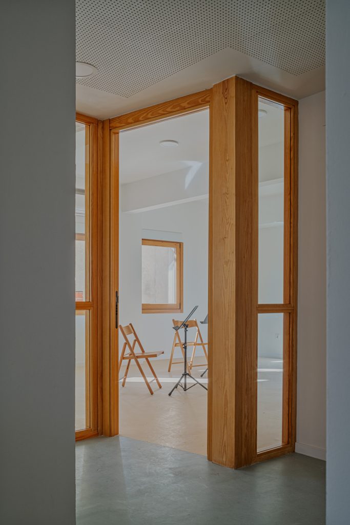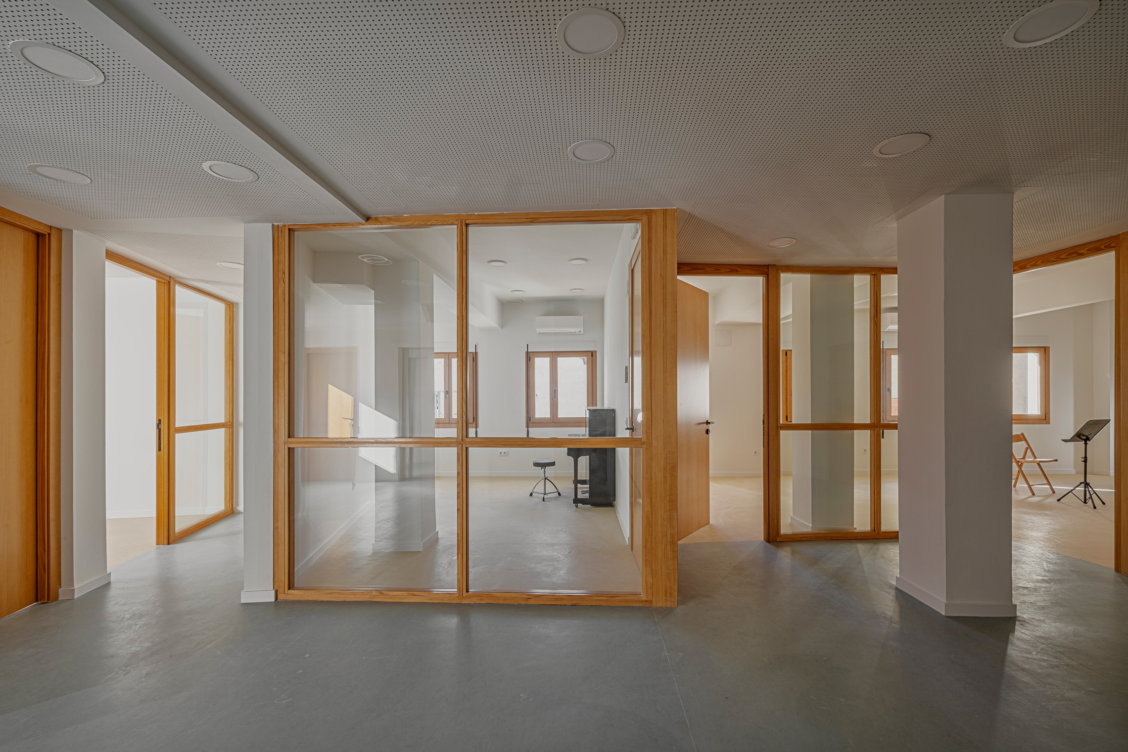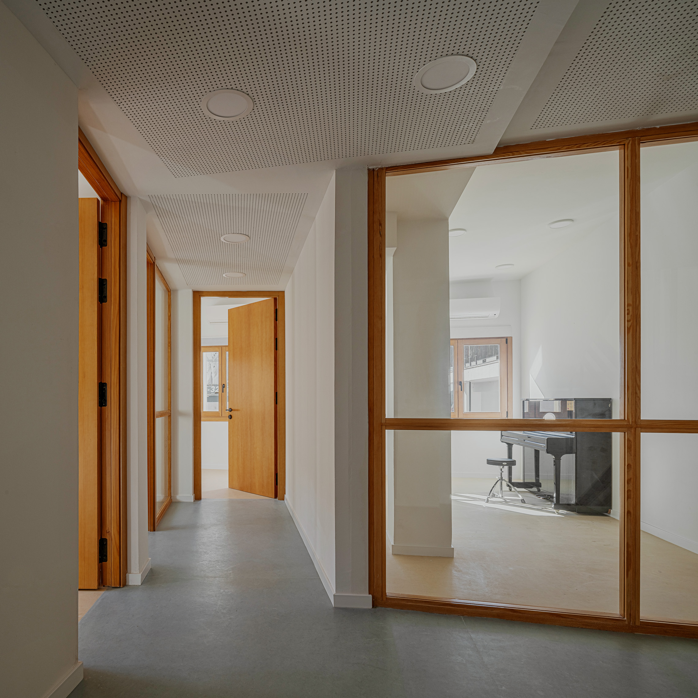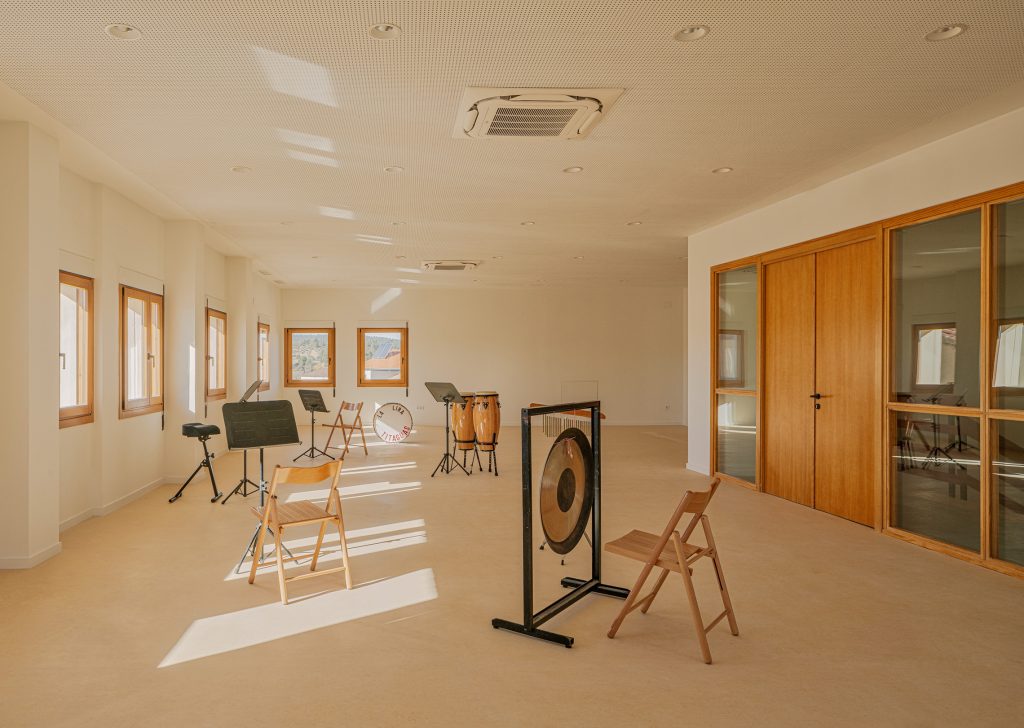La Escuela de Música, centrada en la parte educativa, consiste en la rehabilitación de la antigua escuela, creando diversos espacios como aulas para clases individuales y grupales, salas de ensayo y una sala amplia para presentaciones y eventos musicales. Estos espacios están diseñados para mantener la tradición musical y ofrecer un entorno inspirador que estimule el aprendizaje y la creatividad de los alumnos.