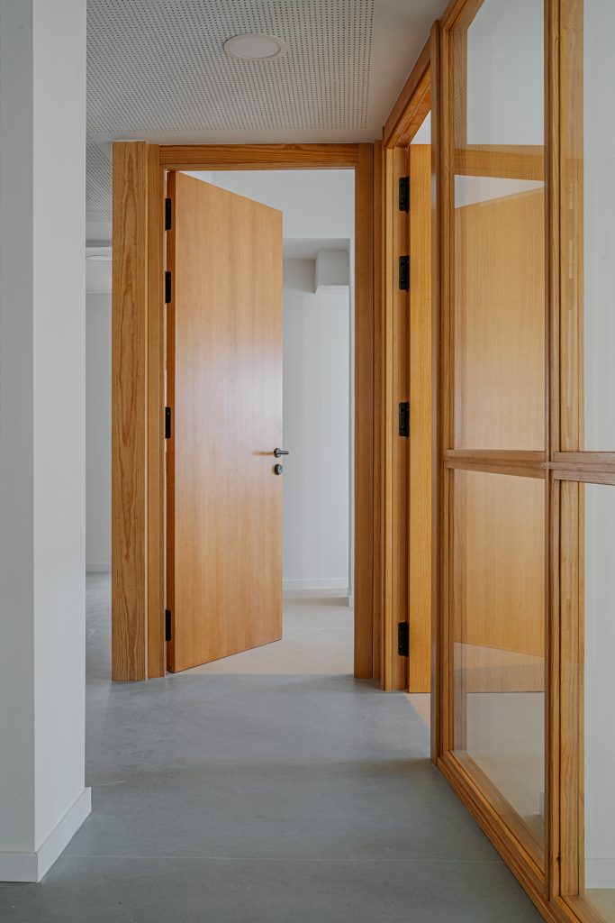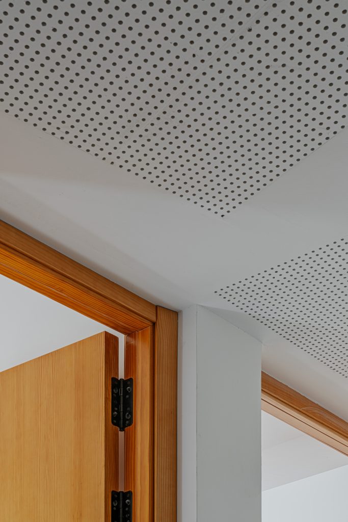 En cuanto a la construcción, se han utilizado materiales sostenibles y naturales, como madera para las divisiones interiores, linóleo para las aulas de ensayo y soluciones acústicas en los techos. El proyecto implica una redistribución completa del edificio, adaptándolo a los nuevos usos y requerimientos de la escuela. Mediante una geometría orgánica, se crean aulas de diferentes tamaños y se mejora la acústica del interior.